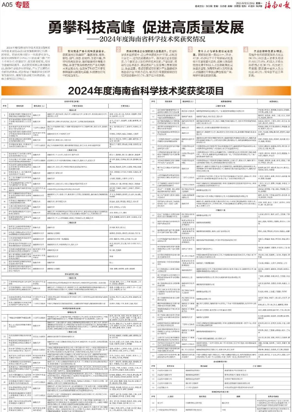 2024年度海南省科学技术奖是《海南省科学技术奖励办法》及实施细则修订后第一次授奖。在提名项目较上一年度增长30%,获奖比例控制在35%以下(比此前下降了约十个百分点)的情况下,获奖难度更高,项目含金量相应提升。